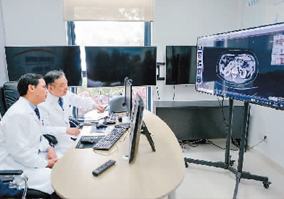 3月25日,浙医二院长兴院区国际远程会诊现场,美国加州大学洛杉矶分校肿瘤外科专家正在查看患者的病理影像资料。