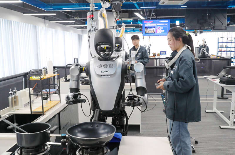3月18日,山东省青岛市人形机器人数据采集训练场,2004年出生的王昆宇在厨房区域根据任务流程进行数据采集。张进刚/摄