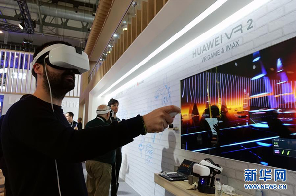 2月28日,在西班牙巴塞罗那,一名男子在世界移动通信大会上的华为展区体验虚拟现实(VR)游戏。 新华社记者 郭求达 摄