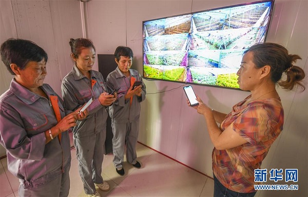 8月26日,河北省故城县农业农村局农技人员(右一)在指导河北盛嘉专业种植合作社工作人员通过手机客户端监测温室大棚各项数据。 近年来,河北省故城县不断加快现代农业产业发展,高标准建设农业产业园,将物联网等高新技术应用于传统农业,推动农业种植现代化、智能化,助力乡村振兴。 新华社记者 李晓果 摄
