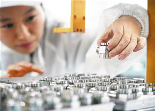 安徽容知日新科技股份有限公司质检员在智能传感器生产车间进行核心元器件质检工作。