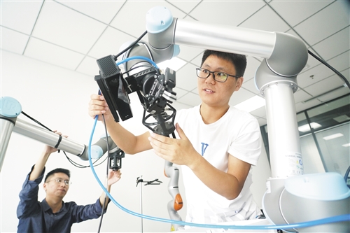 ▲哈工大机器人(合肥)国际创新研究院智能装备研究所工程师在研发智能视觉抓取装置。该研究院集聚多名院士、首席科学家领衔的高端科研人才近300人,申报专利330项,主持或参与国家标准制定8项,承担“智能机器人”国家人工智能平台等多项国家、省、市级重点项目。