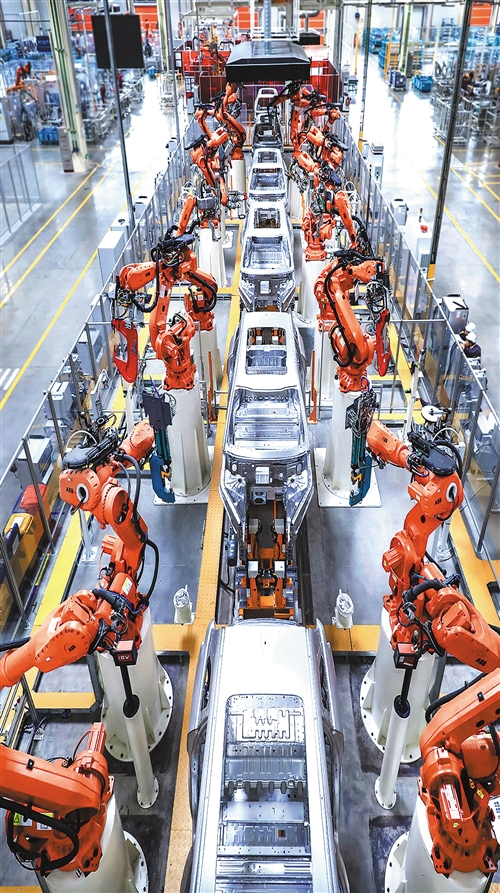 ▲江淮蔚来ES8全铝生产线,全部由机器人完成作业。江淮蔚来汽车生产基地采用“互联网+智造”模式,拥有国内自主品牌首条全铝车身生产线,基地还配备了大量智能化设备,焊装整体自动化率更是高达98%。
