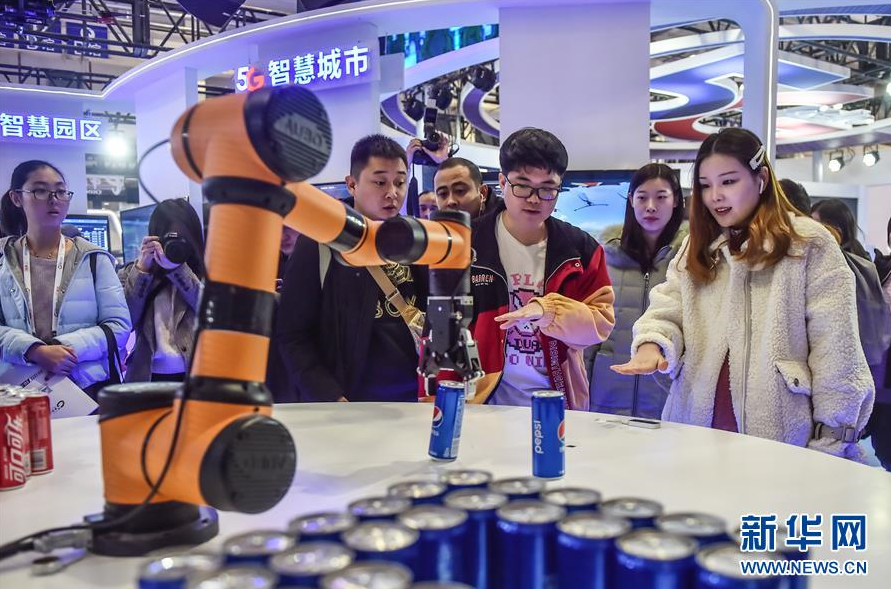 11月21日,参观者体验“隔空取物”,控制机械臂抓取饮料。 当日,主题为“5G改变世界,5G创造未来”的2019世界5G大会在北京开幕。 新华社发(彭子洋摄)