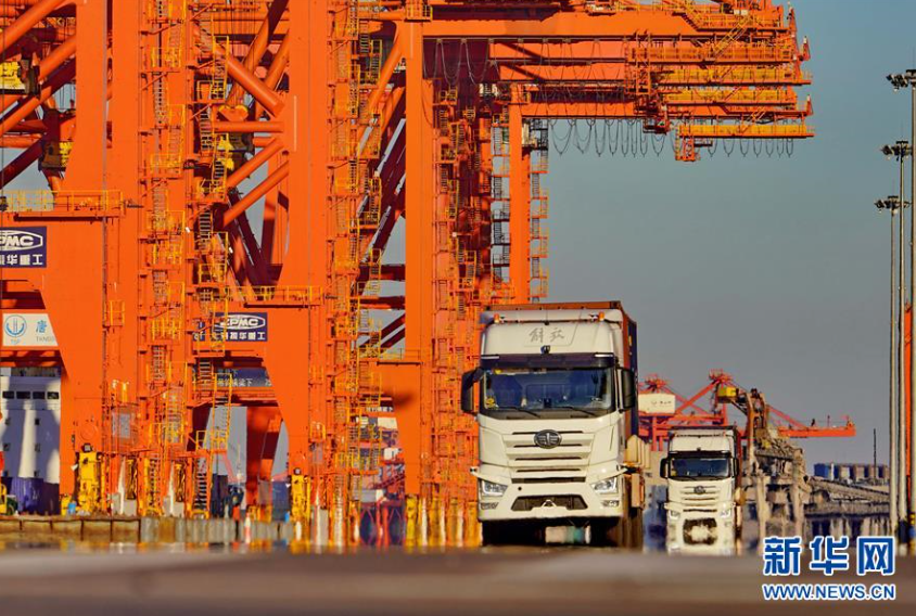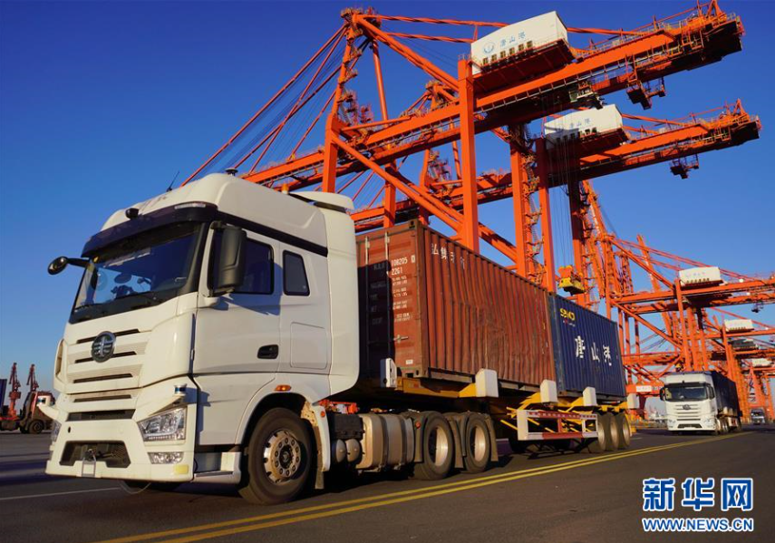 11月25日,无人驾驶集装箱卡车在唐山港京唐港区集装箱码头运送集装箱。 近日,河北省唐山港引进的以5G技术为支撑的无人驾驶集装箱卡车在京唐港区集装箱码头完成港内运行测试工作,进入试运行阶段。 新华社记者杨世尧摄