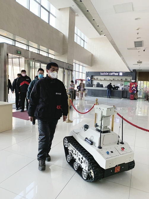 齐鲁软件园履带式机器人成为防疫“尖兵”。(韩霄鹏摄)