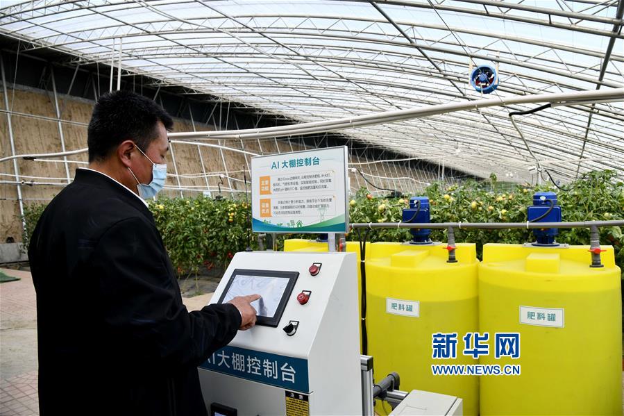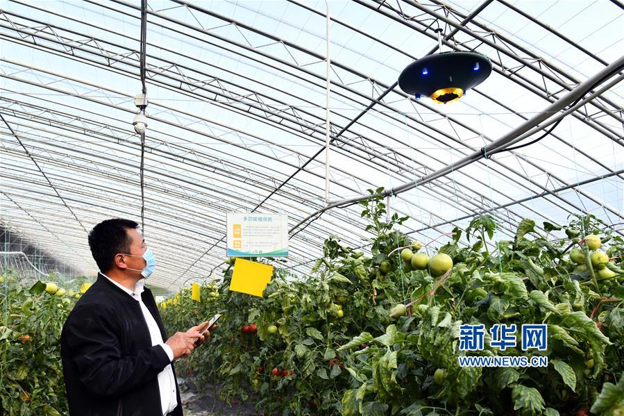 4月21日,在寿光市现代农业高新技术试验示范基地,工作人员赵国胜通过手机操控多功能植保机。 “中国蔬菜之乡”山东寿光市积极推动蔬菜大棚升级换代,2019年将AI人工智能引入蔬菜大棚管理,利用国网山东省电力公司主建的能源大数据中心为数字化汇聚平台,通过物联网设备,自动采集调控蔬菜种植、生长环境等数据。 据悉,AI人工智能技术的应用,将改变寿光蔬菜大棚的管护模式,促进设施农业提质增效。 新华社记者 郭绪雷摄