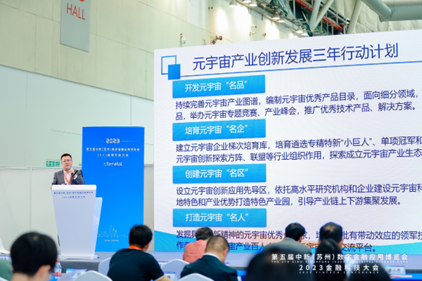 11月2日至4日,第五届中新(苏州)数字金融应用博览会暨2023金融科技大会在苏州工业园区召开。期间,由中国电子商会元宇宙专委会主办、苏州新建元和融科技有限公司承办、江苏元钰昆科技园运营管理有限公司协办的“金融元宇宙创新论坛”于11月3日顺利举办,并吸引了众多业内专家、企业家和政府代表的关注和参与。